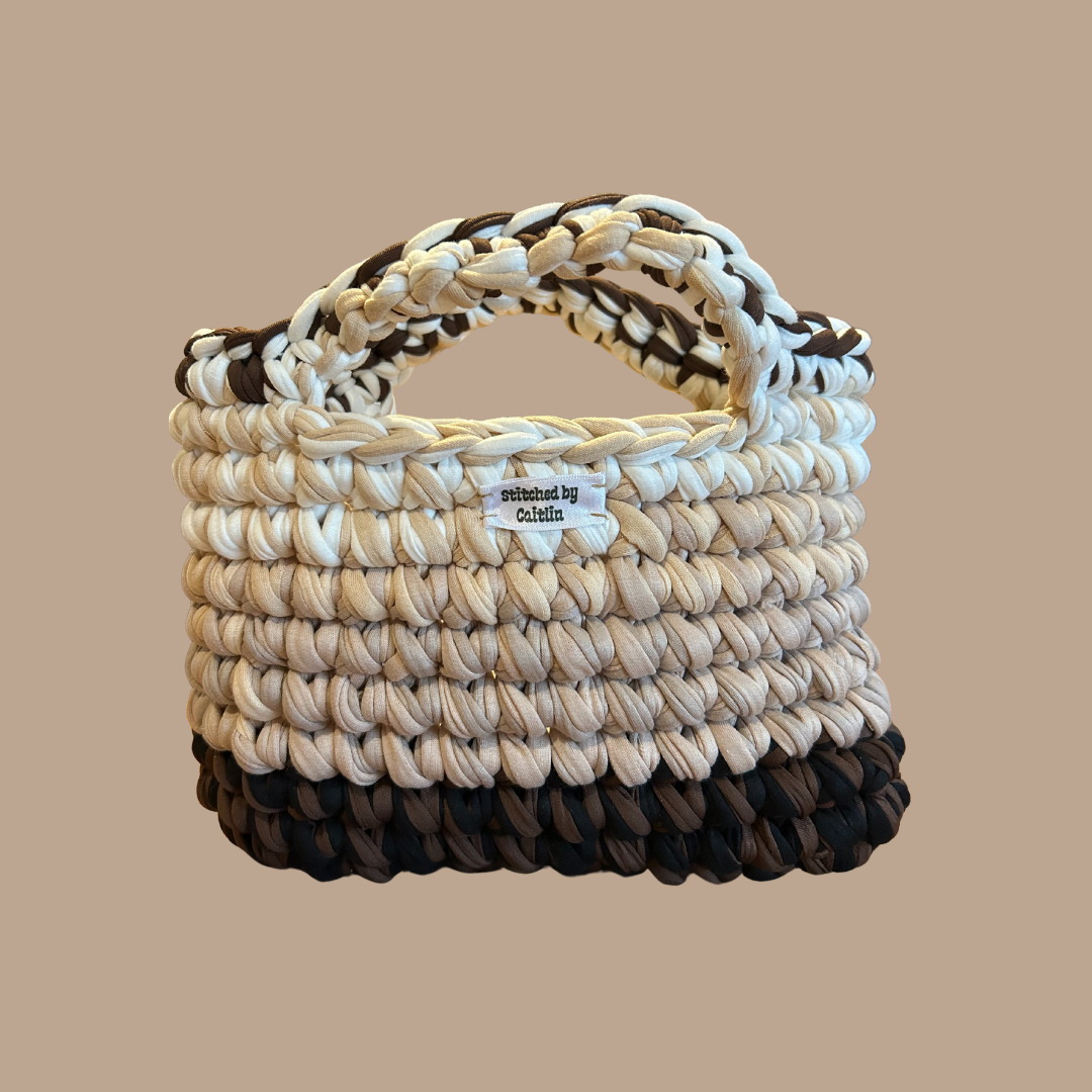 Handmade in the UK from recycled t-shirt yarn. Each bag style will only be made with a certain colour combination once - that means your bag is unique to you!